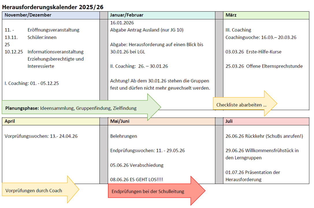 Im Logbuch der Schüler/innen findet sich eine Übersicht zu allen wichtigen Terminen der Herausforderung: Zeitplan Herausforderung 2025/26